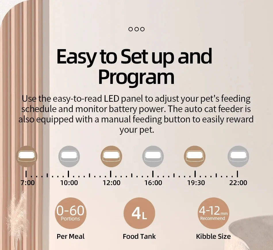 • Auto Feeder pour les chats:Cette mangeoire automatique est conçue spécifiquement pour les chats, garantissant qu'ils reçoivent la quantité de nourriture appropriée à leur taille et à leur niveau d'activité.